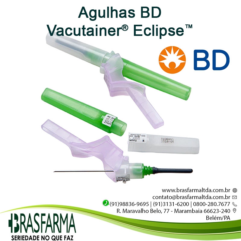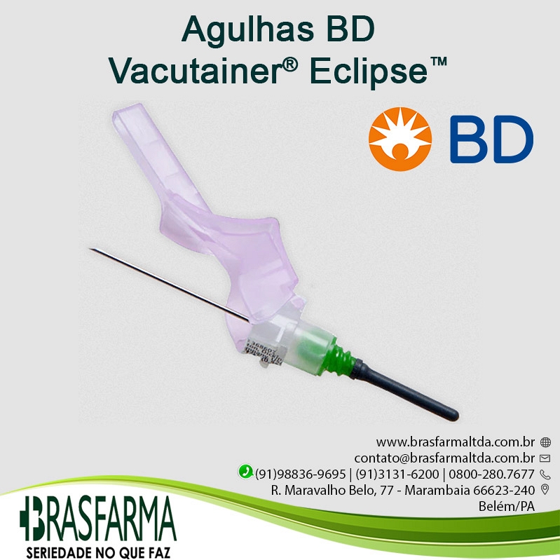BD Eclipse™ Agulha de Segurança - As agulhas BD Eclipse™ são agulhas para coleta de sangue a vácuo com um exclusivo dispositivo de segurança que recobre toda a agulha após seu uso, sem a necessidade de mudar a tecnica de coleta de sangue. Este é ativado com um dedo, reduzindo o risco de uma punção acidental e reutilização. Esta agulha faz parte dos produtos SAFETY da BD Vacutainer® , que atende por completo a LEI NR32.